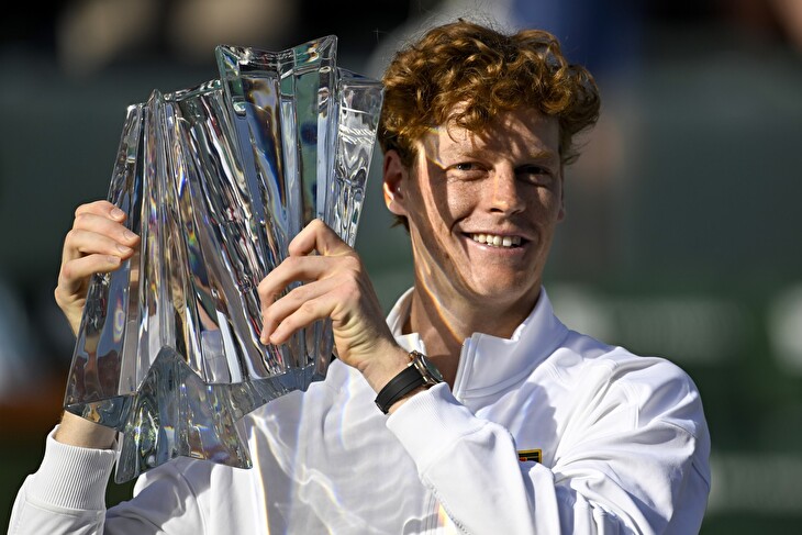 Jannik Sinner s trofejí pro vítěze Indian Wells. (@ Charles Baus / Zuma Press / Profimedia)